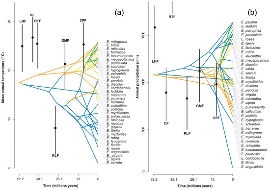 Reconstruction of the climatic niche of (a) the mean annual temperature and (b) annual precipitation for the genus Escallonia over time. The estimated temperatures for six formations are shown in black: Laguna el Hunco Flora (LHF), Quinamavida Flora (QF), Río Turbio Flora (RTF), Río Leona Flora (RLF), Goterones–Matanzas Flora (GMF), and Cerro Los Pololos Flora (CPF). The points represent the average of climate estimation, and the bars represent the standard error ranges.