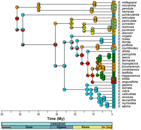 Estimation of the distribution of the most recent common ancestor for each node, according to the DEC model. N corresponds to the northern Andes, Peru being the southern limit; C, the central Andes, including the Yungas and the eastern part of the Cordillera; S, the southern Andes, including south-central Chile; and B, those of Brazil. On the other hand, NC indicates northern and central Andes; CB, central and Brazil; and CS, central and southern Andes. The colors of the circles represent the relative probability of distribution areas, and the mixture between them, such as the brown color, indicates a wider distribution in the central and southern Andes.