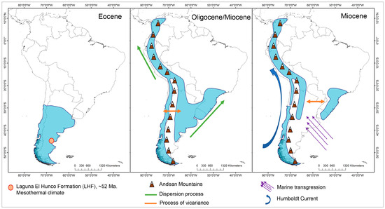 Paleoclimatic estimates suggest global temperatures between 8 and 12 °C higher during this period than at present [38], less pronounced equator–pole temperature gradients and tectonic conditions in which South America, Antarctica and Australia were joined, and the Andes did not have its current height [13,39]. The presence of Escallonia in the fossil record of Laguna del Hunco (42° S in Argentinean Patagonia) indicates that the genus would have been distributed in the area under mesothermal climate conditions with average annual temperatures of 17.2 ± 2.3 °C and precipitation of 1673 ± 426 mm. [40,41]. Our estimate of 13.8 °C and an annual rainfall of 1000 mm (Figure 3), although slightly lower than 14 °C, is consistent with a mesothermal climate for the early Eocene. These mesothermal conditions would have been widespread in mid (>30° S) and high latitudes of the Paleocene and Eocene in South America [39], which implies that the initial area of diversification of the genus was in temperate latitudes.
