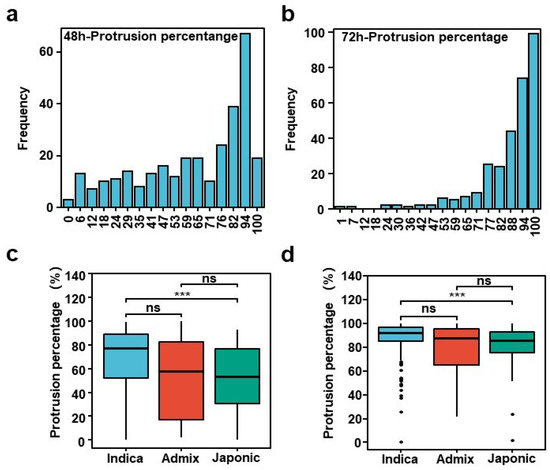 There were large variations in the PP among the 302 accessions at 48 h and 72 h. The protrusion percentage ranged from 0% to 100% in 48 h and 72 h, with an average of 60.96% and 84.88%, and the coefficient of variation was 46.72% and 19.06%. The absolute values of the kurtosis were −0.06 and −2.28 and the skewness of the population was −0.83 and 6.47 (Supplementary Table S2), which indicates that the frequency distribution of the percentage of the protrusion showed a continuous distribution (Figure 1a,b). The statistical analysis of the protrusion percentage in the different subgroups in the two stages showed significant differences between Japonica and Indica (Figure 1c,d).