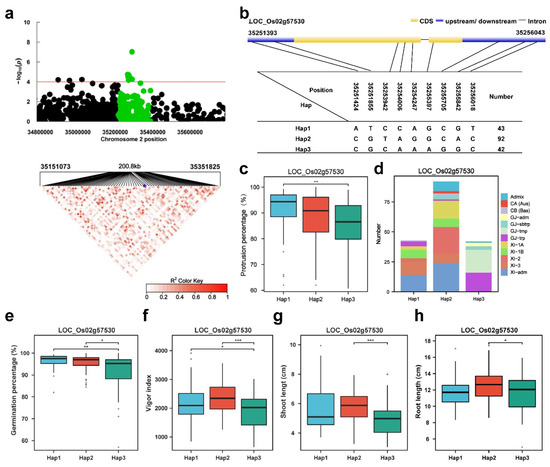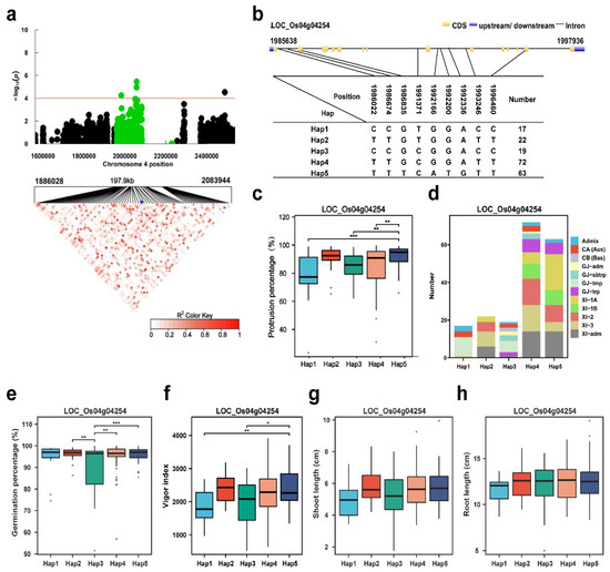 LOC_Os04g04254 (CTB2) haplotype significance analysis. (a) Plot of linkage disequilibrium for SNPs with −log10 p-value > 4 in qPP4 on Chr.4; (b) diagram of CTB2 structure and the positions of 7 SNPs used for haplotype analysis, bar = 100 bp; (c) comparison of the PP values between accessions and different haplotypes. * p ≤ 0.05; ** p ≤ 0.01; *** p ≤ 0.001; (d) subpopulation composition of CTB2 haplotypes for PP; (e–h) comparisons of germination percentage (%), vigor index, shoot length (cm) and root length (cm) among accessions with different haplotypes. Blue asterisk: Position of LOC Os04g04254 (CTB2). * p ≤ 0.05; ** p ≤ 0.01; *** p ≤ 0.001.
