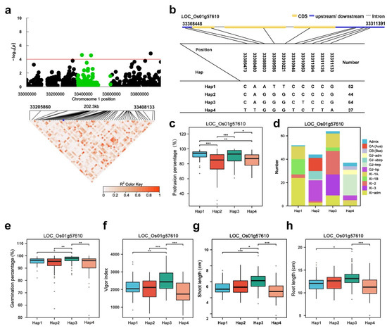 LOC_Os01g57610 (GH3.1) haplotype significance analysis. (a) Plot of linkage disequilibrium for SNPs with −log10 p-value > 4 in qPP1 on Chr.1; (b) diagram of GH3.1 structure and the positions of 7 SNPs used for haplotype analysis, bar = 100 bp; (c) comparison of the PP values between accessions and different haplotypes. (d) subpopulation composition of GH3.1 haplotypes for PP; (e–h) comparisons of germination percentage (%), vigor index, shoot length (cm) and root length (cm) among accessions with different haplotypes. Blue asterisk: Position of LOC Os01g57610 (GH3.1).* p ≤ 0.05; ** p ≤ 0.01; *** p ≤ 0.001.