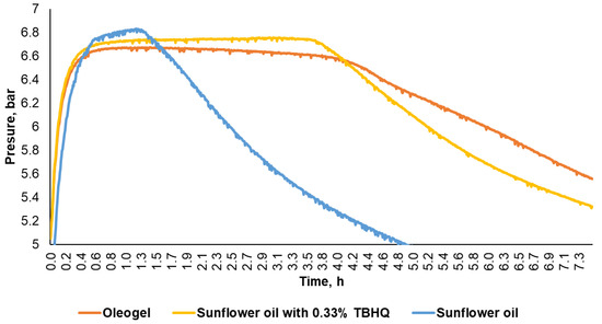 Due to their high oil content, oleogels are characterized by instability in an oxygen environment, so at the beginning of the study, an oxidative stability test of the oleogel was performed, which was compared with a pure sunflower oil sample and an oil sample containing TBHQ (tertiary butylhydroquinone).