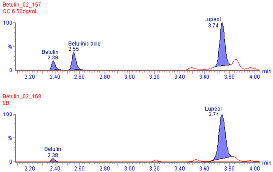 Overlay of MRM chromatograms of (upper) blank rat plasma sample spiked with betulin, betulinic acid, and lupeol at a concentration of 50 ng/mL and (lower) rat plasma sample collected 4 h after peroral administration of oleogel at a dose of 1 g/kg.