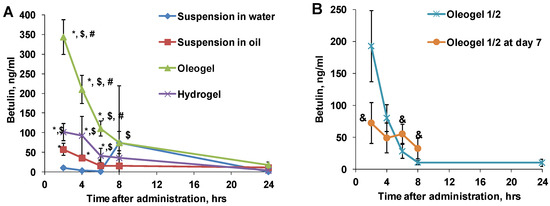 Measured concentration of betulin in rat plasma samples after peroral administration of various BBE-containing dispersed systems (A) and oleogel at a ½ dose after single and repeated administration (B). Each value was calculated as the mean ± S.E.M. of 4–5 rats. Kruskal–Wallis test * p < 0.05 vs. suspension in water, $ p < 0.05 vs. suspension in oil, # p < 0.05 vs. hydrogel, and & p < 0.05 vs. single administration of ½ dose.