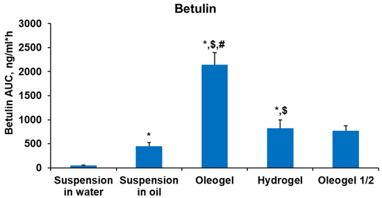 Total exposure (AUC) of betulin in rat plasma after peroral administration of various BBE-containing dispersed systems. Each value was calculated as the mean ± S.E.M. of 4–5 rats. Kruskal–Wallis test * p < 0.05 vs. suspension in water, $ p < 0.05 vs. suspension in oil, # p < 0.05 vs. hydrogel.