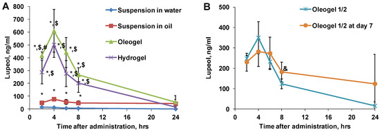 Measured concentration of lupeol in rat plasma samples after peroral administration of various BBE-containing dispersed systems (A) and oleogel at a ½ dose after single and repeated administration (B). Each value was calculated as the mean ± S.E.M. of 4-5 rats. Kruskal–Wallis test * p < 0.05 vs. suspension in water, $ p < 0.05 vs. suspension in oil, # p < 0.05 vs. hydrogel and & p < 0.05 vs. single administration of ½ dose.