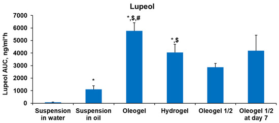 Total exposure (AUC) of lupeol in rat plasma after peroral administration of various BBE-containing dispersed systems. Each value was calculated as the mean ± S.E.M. of 4–5 rats. Kruskal–Wallis test * p < 0.05 vs. suspension in water, $ p < 0.05 vs. suspension in oil, # p < 0.05 vs. hydrogel.