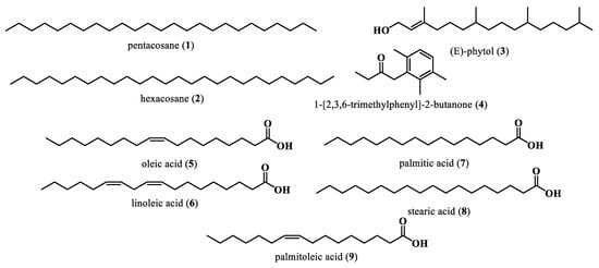 The phytochemical composition of the volatile constituents of the ethanolic extract from the leaves of M. oleifera was reported by Kute in 2017; a total of forty-four volatile compounds have been identified with pentacosane (1) (17.4%), hexacosane (2) (11.2%), (E)-phytol (3) (7.7%), and 1-[2,3,6-trimethylphenyl]-2-butanone (4) (3.4%) as major constituents [2]. M. oleifera seed oil content ranges between 35 and 40% [49]. Oleic acid (5) (65%), linoleic acid (6) (16%), palmitic acid (7) (12.31%), stearic acid (8) (5.1%), and palmitoleic acid (9) (2.1%) are found to be its most important fatty acids [50] (Figure 2).