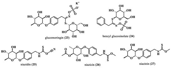 Isothiocyanates with thiocyanates and thiocarbamates are secondary metabolites derived from glucosinolates and have garnered significant attention because of their pharmacological properties. The principal isothiocyanates isolated from M. oleifera include niazidin (25), niazicin (26), or niazinin (27) [54].
