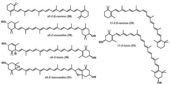 Carotenoids are highly unsaturated fat-soluble pigments that provide fruits, vegetable fungi, bacteria, and algae their characteristic red, orange, or yellow color [55,56] (Figure 5). Carotenoids are subdivided into two groups: the carotenes (precursor of vitamin A) with a single long carbon chain and the xanthophylls, with oxygen atoms attached to their structure [56]. Moringa fresh leaves were found to contain an important amount of β-carotene (6.6–17.4 mg/100 g), higher than in carrots, pumpkins, and apricots [55,57,58]. The β-carotene content in Moringa dried leaves was even higher, about 23.31 to 39.6 mg per 100 g of dry matter. Other different carotenoids were identified in the flowers, fruits, and fresh leaves of eight Moringa oleifera commercially grown cultivars in India and included all-E-β-carotene (28), all-E-zeaxanthin (29), all-E-lutein (30), all-E-luteoxanthin (31), 15-Z-β-carotene (32), and 13-Z-lutein (33) [55].