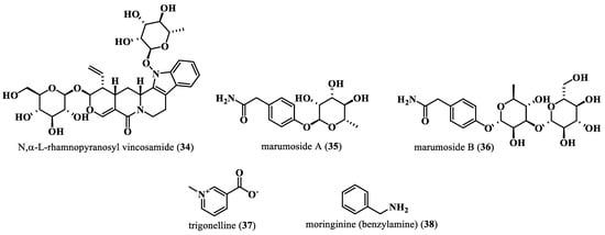 Alkaloids are an assembly of naturally occurring chemical composites, typically comprising basic nitrogen atoms; they are miscellaneous elements and biomolecules, secondary compounds derived from amino acids or transamination [59] (Figure 6). There are three major alkaloid groups, namely pseudoalkaloids, true alkaloids, and protoalkaloids. Compared to pseudoalkaloids, the true alkaloids and protoalkaloids are derived from amino acids. Almost all true alkaloids have a bitter taste [59]. The presence of many alkaloids has been reported in the Moringa tree. N,α-l-rhamnopyranosyl vincosamide (34) was the most commonly reported Moringa plant indol alkaloid, which was isolated from the leaves. These leaves were also reported to contain glycosides of a pyrol alkaloid such as marumosides A (pyrrolemarumine 4″-O-α-l-rhamnopyranoside) (35) and marumosides B (4′-hydroxyphenylethanamide) (36) [53]. M. oleifera was also reported to contain two, as trigonelline (37) [60] or moringinine (benzylamine) (38) [61].