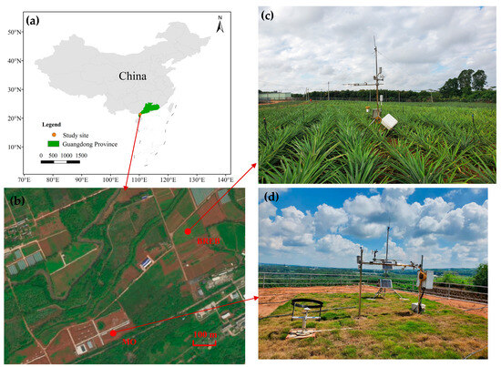 The study site is located in Zhanjiang, the largest pineapple production area in China (Figure 1a). This region experiences a subtropical monsoon climate characterized by an average annual temperature of 23.6 °C, an average annual rainfall of 1619.6 mm, an average annual ET0 of 1242.7 mm, and an average annual sunshine duration of 1946.5 h. The majority of precipitation occurs from May to October, accounting for 83.1% of the annual precipitation [38].