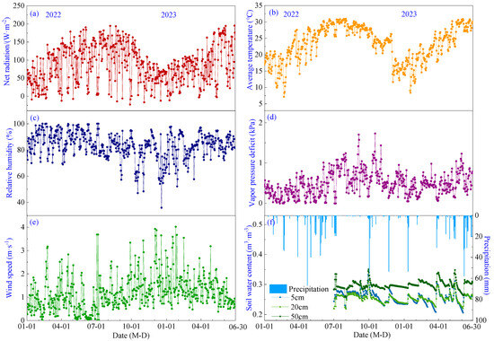 Seasonal variations of meteorological factors and soil water content during the growing period of pineapple: (a) Net radiation; (b) Air temperature; (c) Relative humidity; (d) Vapor pressure deficit; (e) Wind speed; (f) Precipitation and soil water content.