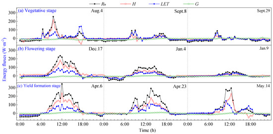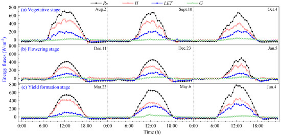 Agro-ecosystems are dynamic systems driven by solar radiation, where processes such as energy flow, material synthesis transfer and water–carbon cycle take place. These processes can vary significantly due to factors like crop types, growth periods, diurnal and seasonal fluctuations, climate conditions and anthropogenic disturbances to the underlying surface [42,43]. These variations can result in differences in the distribution of various energy components within the agro-ecosystem following the entry of net radiation [43].