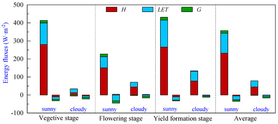 The daily variation curves of energy fluxes at different growth stages on typical cloudy days are shown in Figure 4. It can be seen that due to the increasing influence of cloud cover on radiation, as the cloud cover fluctuates, the flux curves exhibit multi-peak characteristics during the day, and all flux values are significantly lower.