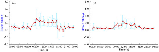 Daily variation of Bowen ratio β under different weather conditions: (a) Sunny days; (b) Cloudy days.