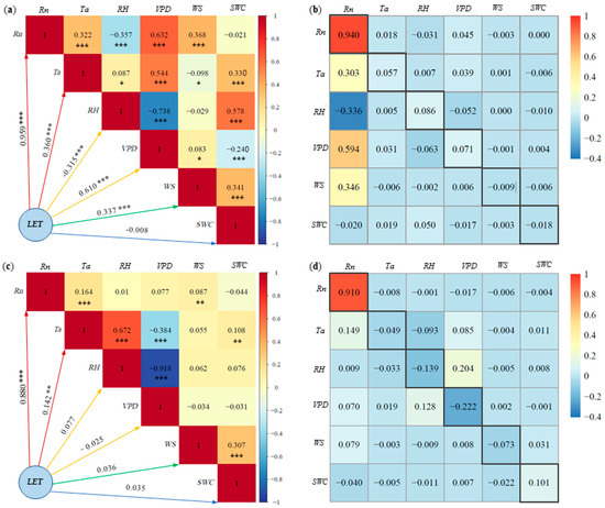 Latent heat fluxes (LET) and environmental factors of: (a) correlation analysis on sunny days, (b) path analysis on sunny days, (c) correlation analysis on cloudy days, (d) path analysis on cloudy days. * Significant at p < 0.05; ** significant at p < 0.01; *** significant at p < 0.001. Note: The number in the black frame is the direct path coefficient.