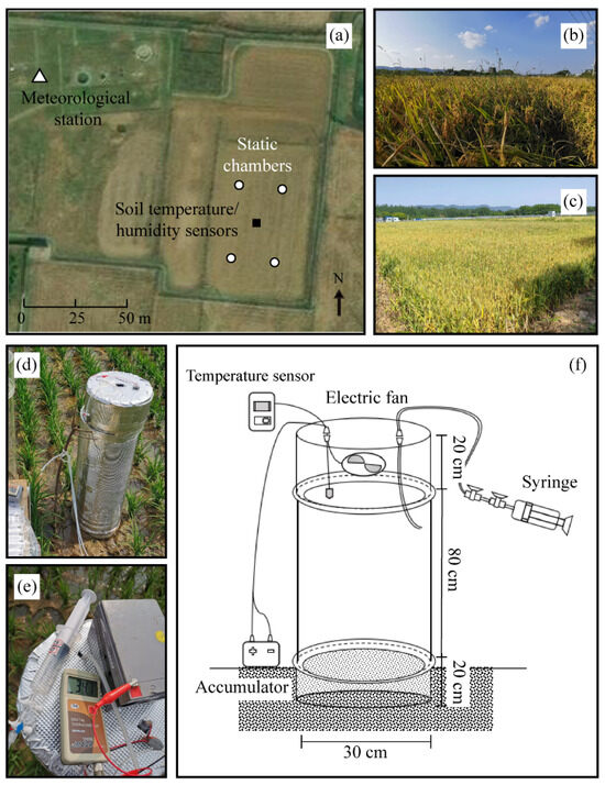 Overview of the study site for the N2O fluxes in the cropland ecosystems. (a) distribution of sampling points, meteorological station, and water-carbon flux monitoring devices within the field, (b,c) show the growing seasons of rice and winter wheat at the study site, respectively, and (d,e) image and (f) diagram of the field N2O fluxes sampling device. The small white circles, white triangles, and black squares show the location of the static chambers, meteorological stations, and soil temperature and humidity sensors, respectively.
