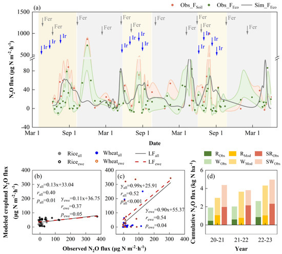 Observed and modeled nitrous oxide (N2O) fluxes at the study site. (a) Observed and modeled N2O fluxes in 2020–2023. “Fe” and “Ir” represent fertilization and irrigation activities scheduled during the rice and wheat growing season. “FSoil” and “FEco” represent seasonal changes in N2O fluxes in cropland without and with crops, respectively. The green−color−filled and red−color−filled areas show the corresponding standard errors. Correlations between the observed and modeled N2O fluxes during rice (b) and winter wheat (c) growing season at the study site. “LFall” and “LFewe” represent linear fits between observed and modeled N2O fluxes for the entire growing season and the period of extreme weather events, respectively. (d) Cumulative N2O fluxes in rice and wheat fields from 2020 to 2023. “RObs” and “WObs” represent the observed N2O fluxes during the growing seasons of rice and wheat, respectively, while “RMod” and “WMod” represent the corresponding modeled values. “SRObs” and “SWObs” represent the observed N2O fluxes of bare soil during the growing seasons of rice and wheat, respectively.