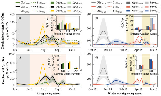 Influences of extreme weather events on cropland ecosystem nitrous oxide (N2O) fluxes and cropland soil N2O fluxes at the study site. Observed (solid lines) and simulated (dash lines) cropland ecosystem and soil N2O fluxes dynamics in the rice (a,c) and winter wheat (b,d) rotation cropland for three observation years. The color−filled areas show the corresponding standard errors of the measurements. “SH”, “CH”, and “AP” represent a single extreme heat event, two consecutive extreme heat events, and abnormal precipitation (extreme precipitation and drought) events during the rice growing season, respectively. “EP” and “ED” represent extreme precipitation and drought events during the wheat growing season, respectively. “Oewe” and “Sewe” represent the observed and simulated average N2O fluxes during periods of extreme weather events, respectively. The gray and orange rectangular areas represent abnormal precipitation events and extreme heat events that occurred during the rice growing season, respectively. The yellow rectangular areas represent abnormal precipitation events that occurred during the wheat growing season.