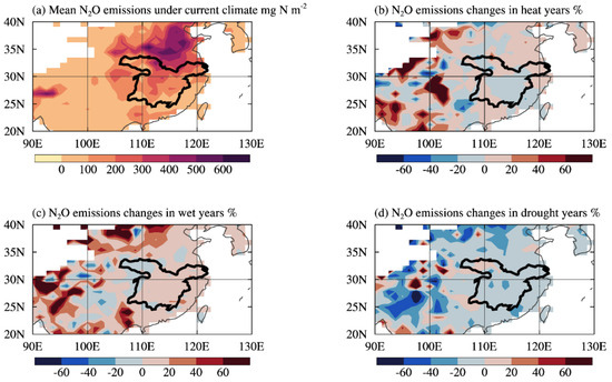 Spatial distribution of average annual N2O emissions (a) and corresponding changes (b–d) from rice and wheat cropland ecosystems in the Middle and Lower Reaches of the Yangtze River from 1997 to 2016 under the current climate scenario.