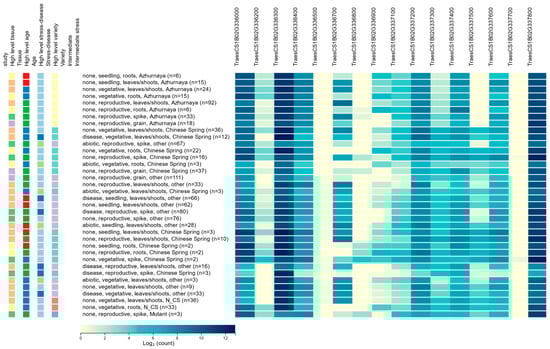 Wheat eFP browser (http://bar.utoronto.ca/efp_wheat/cgi-bin/efpWeb.cgi) (accessed on 8 August 2020) and Wheat Expression Browser (expVIP) (http://www.wheat-expression.com/) (accessed on 8 August 2020) were used to accumulate the expressional behavior of the gene. These databases stored the gene expression information of the previously published experiments, which cover a wide range of contexts [37,38]. Detailed information on the expressional behavior, such as time, tissue/organ, and expression level of all the listed genes, was compiled for a relative comparison. Only the expression levels above the threshold were considered for the gene selection [39].