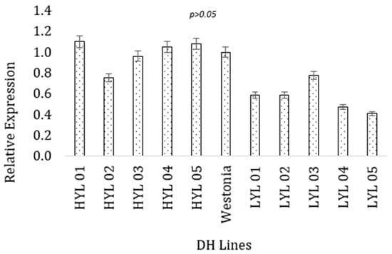 For the TPR gene, the highest expression was obtained in the high-yielding parent Westonia (Figure 4), which was similar to the high-yielding lines (p = 0.12) but statistically different from the low-yielding lines (p = 4.76 × 10−5). The high-yielding DH lines had higher values of gene expression (M = 0.99, SD = 0.044) than the low-yielding DH lines (M = 0.661, SD = 0.161). A t-test for independent samples (equal variance assumed) showed this difference was statistically significant, t = −7.526, p = 0.000.