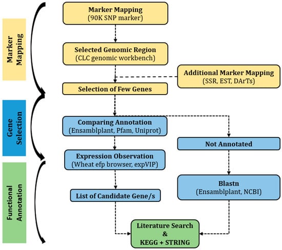 The computational approach, generally called the in silico approach, employs several steps to screen out the non-contributing genes, which include identifying variation in the DNA sequence and SNP (single nucleotide polymorphism), characterizing biological pathways, and understanding functional evolution. It focuses on the integration and visualization of all the available information from different platforms. In silico approaches to short-listing the candidate genes provide the opportunity to reduce the workload of downstream laboratory experiments and the costs involved [10]. The recently released whole genome sequence of bread wheat (Triticum aestivum) can undoubtedly assist in overcoming the bottleneck. Also, significant advancements in producing powerful tools for in silico analysis in recent years have made it possible to follow this process.