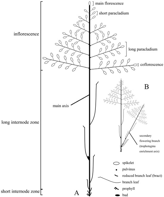 - Vegetti, A.C.; Anton, A.M. The synflorescence concept in Poaceae. Flora 1996, 191, 231–234. [Google Scholar] [CrossRef]