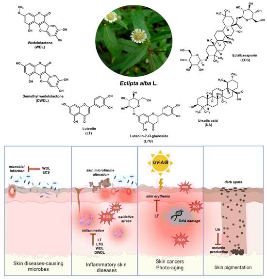 Myo, H.; Liana, D.; Phanumartwiwath, A. Unlocking Therapeutic Potential: Comprehensive Extraction, Profiling, and Pharmacological Evaluation of Bioactive Compounds from Eclipta alba (L.) Hassk. for Dermatological Applications. Plants 2024, 13, 33. https://doi.org/10.3390/plants13010033