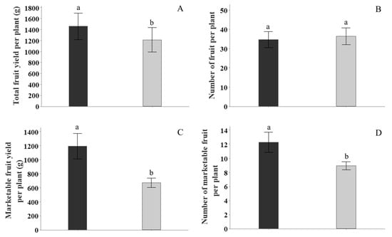 The effect of fortified biostimulant extract (FBE) on (A) tomato fruit weight (yield), (B) number of tomato fruit per plant, (C) marketable tomato fruit weight (yield), and (D) number of marketable fruit per plant, at harvest (119 DAT—days after transplant). Black columns are for the FBE treatment, and the grey columns are for the untreated controls. The FBE treatment significantly increased the total fruit yield, marketable fruit yield, and number of marketable fruit per plant relative to the untreated control. Means followed by the same letter do not significantly differ (p ≤ 0.05). Error bars represent SE of means (n = 14).