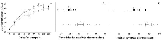 The effect of fortified biostimulant extract (FBE) on (A) chlorophyll content, (B) flower initiation day, and (C) fruit set day, at different DAT (days after transplant). Black circles are for the FBE treatment, and the grey triangles are for the untreated control. The means in (B,C) are shown as the larger circle or triangle. The FBE treatment significantly increased the three physiological assessments relative to the untreated control. Means followed by the same letter do not significantly differ (p ≤ 0.05). Error bars represent SE of means (n = 14).