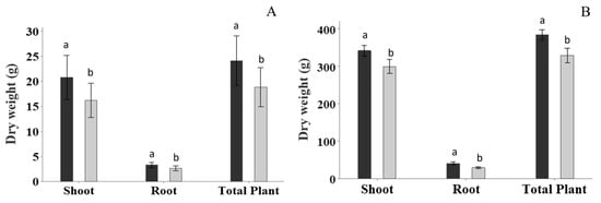 The effect of fortified biostimulant extract (FBE) on shoot dry weight, root dry weight, and total plant dry weight at (A) flowering (35 DAT: days after transplant) and (B) harvest (119 DAT) timepoints. Black columns are for the FBE treatment, and the grey columns are for the untreated control. The FBE treatment significantly increased the three biomass assessments relative to the untreated control. Means followed by the same letter do not significantly differ (p ≤ 0.05). Error bars represent SE of means (n = 14).