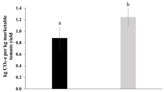 The effect of fortified biostimulant extract (FBE) on greenhouse gas emissions related to the production of marketable tomato yield. The black column is for the FBE treatment and the grey column is for the untreated control. The FBE treatment significantly decreased the greenhouse gas emissions intensity relative to the untreated control. Means followed by the same letter do not significantly differ (p ≤ 0.05). Error bars represent SE of means (n = 14).