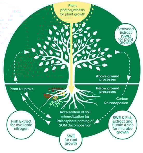 Productive agriculture relies on the connectivity of the soil and plant ecosystems. However, the natural ecosystem processes become disconnected in depleted soils that are farmed intensely with limited crop diversity. Similarly, a dependency upon synthetic fertilizer eventually results in fragmented biological, plant, and soil ecosystems [37]. A possible approach for growers to boost, connect, and regenerate the geobiochemical processes (Figure 5) is to combine the benefits provided by different biostimulant ingredients such as seaweed, fish, and humus extracts.