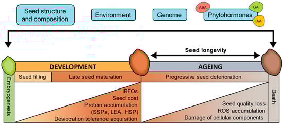 Longevity is progressively acquired during the final stages of orthodox seed development and maturation. These stages are associated with seed filling, acquisition of desiccation tolerance, loss of chlorophyll, and accumulation of the raffinose family oligosaccharides (RFOs) and seed storage proteins (SSPs) [114,115,116,117,118]. These processes have been related to seed longevity and are regulated by genetic programs that integrate hormonal and metabolic pathways mainly controlled by LAFL (i.e., LEC1, ABI3, FUS3, and LEC2) transcriptional regulators [115,119]. The LAFL regulatory network includes the family of B3 domain transcription factors ABI3 (ABSCISIC ACID INSENSITIVE3), FUS3 (FUSCA3), and LEC2 (LEAFY COTYLEDON2); and LEC1 (LEAFY COTYLEDON1), a member of the NFYB protein family [120]. Arabidopsis abi3 and lec1 mutants, in addition to showing a decrease in SSPs, RFOs, and chlorophyll degradation, also have reduced longevity [119]. Along with genetic regulation, environmental conditions during seed development have the potential to exert a profound influence on seed longevity [103,121]. Studies have demonstrated the significance of environmental parameters in shaping seed longevity traits, with light intensity and temperature during seed development showing positive correlations with longevity [122]. Consequently, species originating from cool, temperate climates tend to produce short-lived seeds, while those from warm, arid environments yield seeds with extended lifespans [25,26,102,121,123].