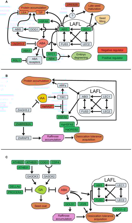 Phytohormone-related genes with effects on seed longevity. (A) Graphic representation of genes related to abscisic acid (ABA); (B) genes related to auxins (IAA) and (C) genes related to gibberellins (GA) signalling pathway.