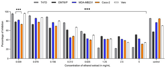 Anti-proliferative activity of different concentrations (0.0390625 mg/mL to 5 mg/mL) of aqueous ethanol (70%) extract of Carthamus oxyacantha on cancer cell lines (T47D, EMT6/P, MDA-MB231, Caco-2) and Vero normal cell line. Results represented as mean ± SD (n = 3). Significance of results represented by p of <0.001 tagged by (***) asterisks. All concentrations are compared with mean values of negative control.
