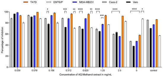 Anti-proliferative activity of different concentrations (0.0390625 mg/mL to 5 mg/mL) of AQ. methanol extract (90%) of Carthamus oxyacantha on cancer cell lines (T47D, EMT6/P, MDA-MB231, Caco-2) and Vero normal cell line. Results represented as mean ± SD (n = 3). Significance is represented by (*) p-value < 0.05, (**) p-value < 0.001, (***) p-value < 0.001 and (****) p-value < 0.0001 significance level. All concentrations are compared with mean values of negative control.