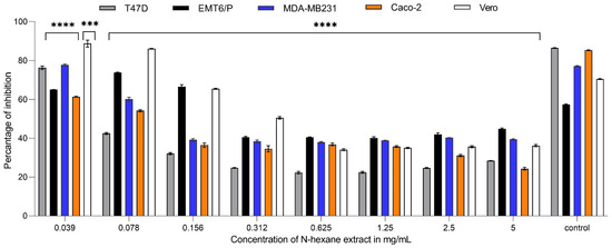 Anti-proliferative activity of different concentrations (0.0390625 mg/mL to 5 mg/mL) of n-hexane extract of Carthamus oxyacantha on cancer cell lines (T47D, EMT6/P, MDA-MB231, Caco-2) and on Vero normal cell line. Results represented as mean ± SD (n = 3). Significance is represented by (***) p-value < 0.001 and (****) p-value < 0.0001 significance level. All concentrations are compared with mean values of negative control.