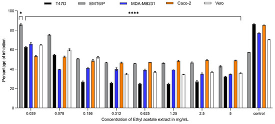 Anti-proliferative activity of different concentrations (0.0390625 mg/mL to 5 mg/mL) of ethyl acetate extract of Carthamus oxyacantha on cancer cell lines (T47D, EMT6/P, MDA-MB231, Caco-2) and on Vero normal cell line. Results represented as mean ± SD (n = 3). Significance is represented by (*) p-value < 0.05, and (****) p-value < 0.0001 significance level. All concentrations are compared with mean values of negative control.
