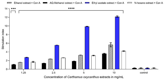 Lymphocyte proliferation assay using Con A as an activator for different Carthamus oxycanthus extracts (aqueous ethanol, aqueous methanol, ethyl acetate, n-hexane) using concentrations between 1.25 mg/mL and 10 mg/mL. Results represented as mean ± SD (n = 3). Significance is represented by (***) p-value < 0.001 and (****) p-value < 0.0001 significance level. All concentrations are compared with mean values of negative control.