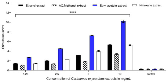Lymphocyte proliferation assay using LPS as an activator for different Carthamus oxycanthus extracts (aqueous ethanol, aqueous methanol, ethyl acetate, n-hexane) using concentrations between 1.25 mg/mL and 10 mg/mL. Results represented as mean ± SD (n = 3). Significance is represented by p < 0.0001 tagged by (****) asterisks. All concentrations are compared with mean values of negative control.