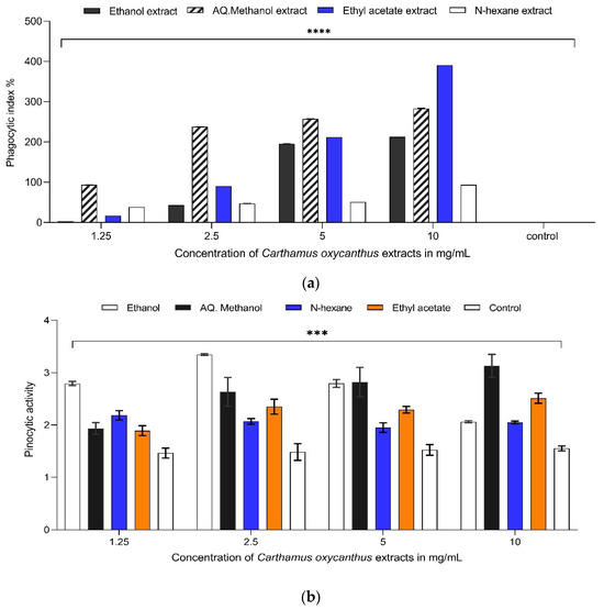 (a) The effects of Carthamus oxyacantha extracts on phagocytosis. The percentage of the phagocytic index for peritoneal macrophage with different concentrations (1.25 mg/mL to 10 mg/mL) of different Carthamus oxyacantha extracts (aqueous ethanol extract (70%), aqueous methanol (90%), n-hexane, ethyl acetate). Results represented as mean ± SD (n = 3). Significance is represented by p ≤ 0.0001 tagged by (****). All concentrations are compared with mean values of negative control. (b) The effects of Carthamus oxyacantha extracts on pinocytosis. The pinocytotic activity of peritoneal macrophage with different concentrations (1.25 mg/mL to 10 mg/mL) of Carthamus oxyacantha extracts (aqueous ethanol extract (70%), aqueous methanol (90%), n-hexane, ethyl acetate). Results represented as mean ± SD (n = 3). Significance is represented by p < 0.001 tagged by (***). All concentrations are compared with mean values of negative control.