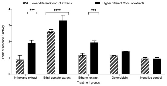 The apoptotic activity assay suggested that the levels of caspase-3 were elevated, suggesting the facilitation of programmed cell death and the inhibition of cellular proliferation (Figure 9). The results indicate that the ethyl acetate extracts exhibited the most significant activity, with a 3.29-fold increase in the levels of caspase-3 and p < 0.0001 compared with the negative control at concentrations of 0.14 mg/mL. The n-hexane and aqueous ethanol (70%) extracts demonstrated comparable levels of significant activity, with values of 1.91 and 1.94 observed at concentrations of 0.50 mg/mL and 4 mg/mL, respectively. The p-values associated with these observations were 0.0005 and 0.0004, respectively, compared with the negative control, as shown in the graph (Figure 9).
