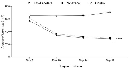 The EMT6/p cells were used to inoculate tumors subcutaneously into Balb/C mice. After seven days, the female Balb/C mice were injected intraperitoneally with 183.2 mg/kg of the two extracts, n-hexane and ethyl acetate (Figure 10). After waiting 19 days, they were sacrificed while continuing to weigh the tumors until day 20. The size of the tumors was determined, and tumor volume was calculated using a formula (Table 4). The size of tumors injected with n-hexane and ethyl acetate extracts was significantly reduced (p < 0.001) compared with the negative control group. Both n-hexane and ethyl acetate extracts had considerable antitumor activity, as measured by the size reduction of the tumors (−49.981% and −51.028%, respectively) compared with the control group (+8.0484%) (Table 4). Two instances of mouse death were reported for the control group, and one mouse showed no tumor after 14 days. The percentage of mice in treatment groups without detectable tumors was 37.5%. However, the mice exhibited typical behavior (the mice behaved in a manner that is considered normal and healthy for their species) without any adverse effects.