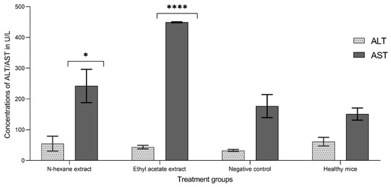 The effects of two different extracts (n-hexane and ethyl acetate) on serum ALT and AST in Balb/C mice bearing the EMT6/P tumor cell line. Results represented as mean ± SD (n = 3). Ethyl acetate extract showed significance in AST concentration represented by p < 0.0001 tagged by (****) asterisks, and n-hexane extract showed significance in AST concentration represented by p of <0.0146 tagged by (*) asterisks. All concentrations are compared with the mean values of the negative control.