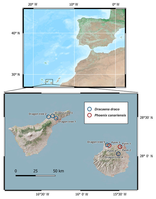 Map of sample locations in the Canary Islands (top panel), with palms (Phoenix canariensis) on Gran Canaria and dragon trees (Dracaena draco) on both Gran Canaria and Tenerife (Table 1; because of their proximity, the blue circle for “Palm 4” is obscured by the red circle for “Dragon tree 4”).
