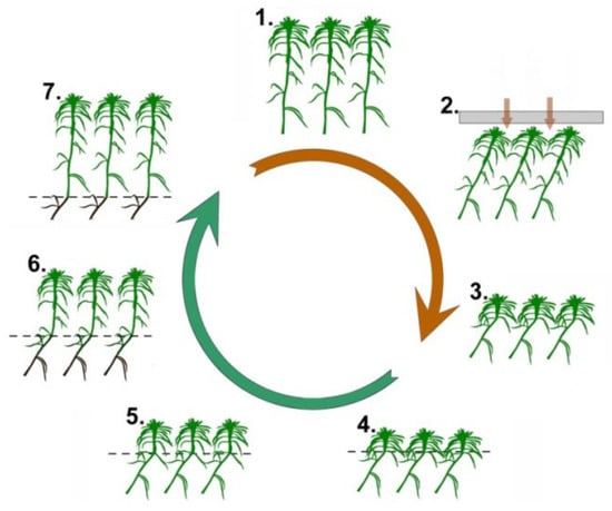 Growth monitoring of S. riparium using geotropic curvatures. The brown arrow (stages 1–3) reflects the induction of geotropic curvatures. It is based on the deviation of initially upright shoots (stage 1) from the vertical under snow or artificial load (stage 2). Geotropic curvatures are formed as natural growth markers on inclined shoots (stage 3). Subsequently, we carefully monitor and document the growth of shoots from these curvatures (green arrow, stages 4–7).